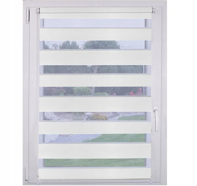Rolety D&N to połączenie praktyczności i dekoracji. Poziome, równoległe paski materiału, ułożone są naprzemiennie z pasami z cienkiej siatki, co tworzy ozdobny efekt a zarazem pozwala regulować zaciemnienie. Prowadnice żyłkowe w komplecie.