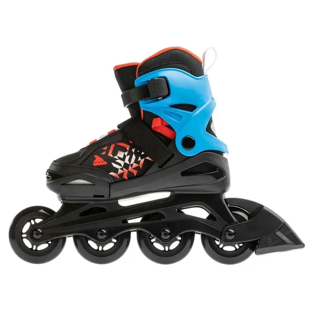 Smukła, lekka struktura zapewnia przyczepność z boku, a wyściółka zapewnia amortyzację. Regulowany system rozszerza cztery rozmiary za pomocą łatwego w obsłudze przycisku, aby mogły rosnąć wraz ze stopą. Połączenie koła i łożyska zapewnia równowagę prędkości i kontroli.