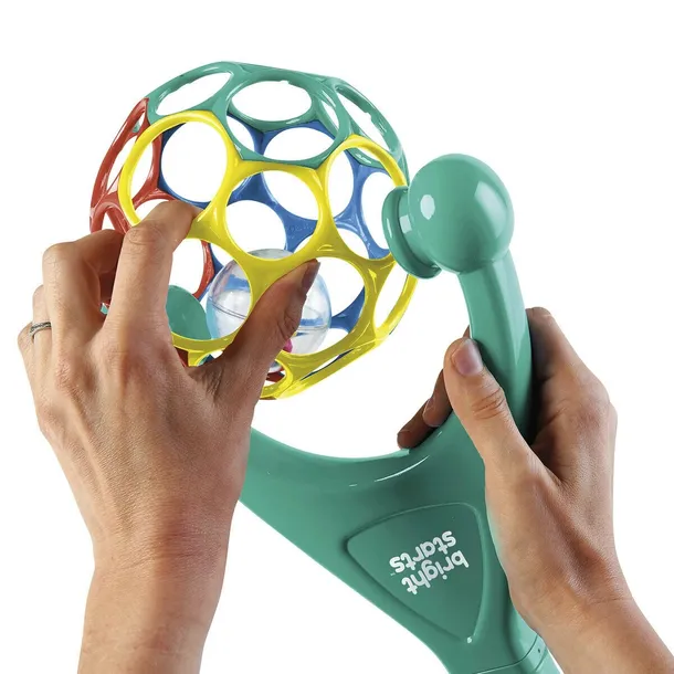 Kolorowa piłka Oball obraca się, a w jej wnętrzu grzechocze przezroczysta piłeczka wypełniona wielobarwnymi kuleczkami.