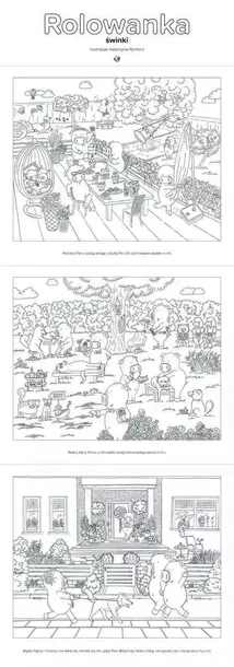 Rolowanka, czyli długa kolorowanka inspirowana życiem codziennym autorki, którą jest Katarzyna Rymorz. Tym razem rysowała życie świnek. 3 kolorowanki zamknięte w tubie będą świetnym prezentem dla najmłodszych. Tuba zawiera metrową kolorowankę, która składa się z 3 kolorowanek.