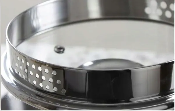 Szklana pokrywa z szerokim rantem oraz dwoma rozmiarami otworów do odcedzania.