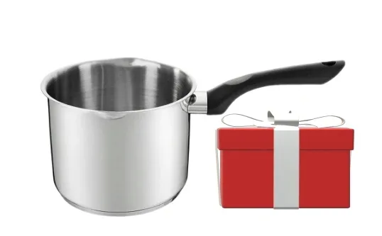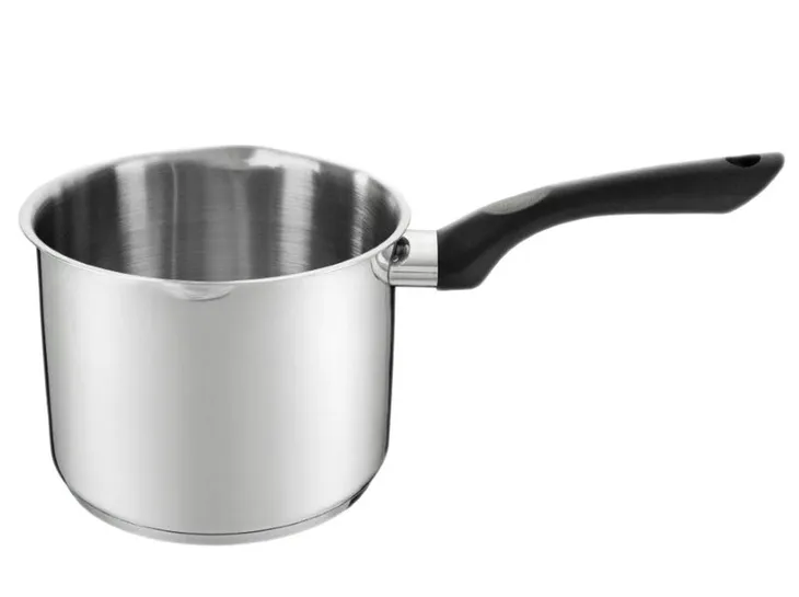Garnek Vikos 2,6 l wykonany z wysokiej jakości stali nierdzewnej o grubości ścianek 0,5 mm. Wielowarstwowe dno równomiernie rozprowadza ciepło, dzięki czemu potrawy szybciej się gotują, co przekłada się na mniejsze zużycie energii i większą oszczędność. Dodatkowym atutem jest skala na wewnętrznej stronie ścianki, ułatwiająca odmierzanie (od 0,5-1,75 l). Garnek posiada wygodny, uchwyt z czarnego tworzywa oraz dwa boczne dzióbki, które ułatwiają przelewanie płynów.