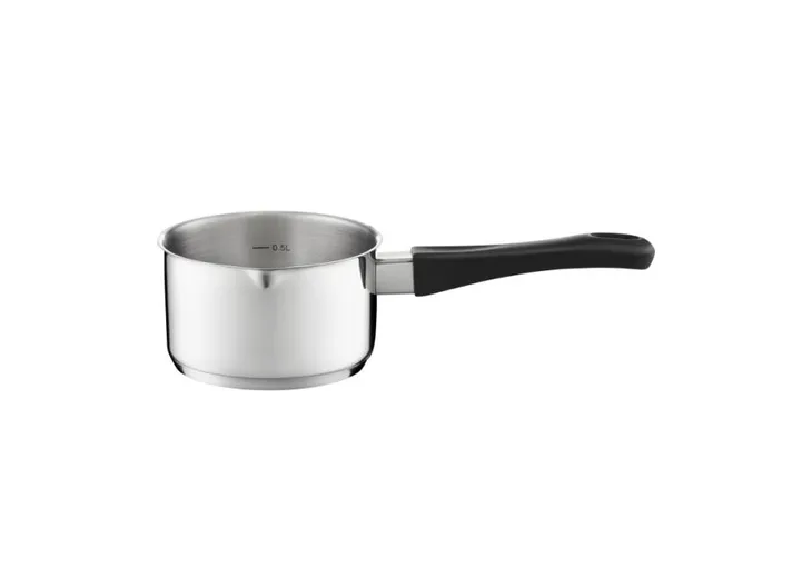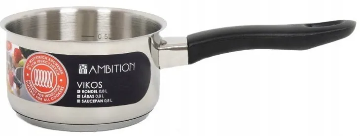 Klasyczny charakter garnków Vikos podkreśla prosty kształt ścianek, natomiast zaokrąglony kształt rączek oraz okrągły uchwyt szklanej pokrywy przełamują ten łagodny design. Garnki dzięki takiemu połączeniu nabierają wyrazistego charakteru. Garnki Vikos wykonane są z wysokiej jakości stali nierdzewnej 18/0 o grubości ścianek 0,5 mm. Wielowarstwowe dno równomiernie rozprowadza ciepło, dzięki czemu potrawy szybciej się gotują, co przekłada się na mniejsze zużycie energii i większą oszczędność. Dodatkowym atutem jest skala na wewnętrznej stronie ścianki, ułatwiająca odmierzanie (od 0,25 l do 0,5 l). Posiada wygodny, nienagrzewający się uchwyt z czarnego tworzywa.