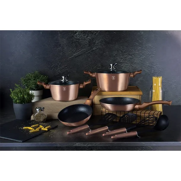 Garnki i patelnie z serii METALLIC firmy BERLINGERHAUS wykonane są z wysokiej klasy kutego aluminium pokrytego wewnątrz potrójną powłoką granitową (marble) o bardzo wysokim współczynniku twardości. Powłoka zewnętrzna występuje w kilku wersjach kolorystycznych o charakterystycznym metalicznym połysku. Te atrakcyjne i modne naczynia wyposażone są standardowo w uchwyty typu SOFT TOUCH (silikon handle). Przystosowane do wszystkich rodzajów kuchenek: gazowa, elektryczna, ceramiczna, halogenowa, indukcyjna. System TURBO INDUCTION (bardzo szybko nagrzewają się) pozwala zaoszczędzić nawet 35% energii.