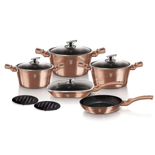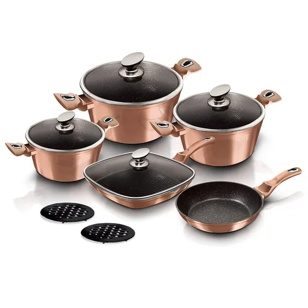 Garnki i akcesoria z serii METALLIC firmy BERLINGERHAUS wykonane są z wysokiej klasy kutego aluminium pokrytego wewnątrz potrójną powłoką granitową (marble) o bardzo wysokim współczynniku twardości. Powłoka zewnętrzna występuje w kilku wersjach kolorystycznych o charakterystycznym metalicznym połysku. Te atrakcyjne i modne naczynia wyposażone są standardowo w uchwyty typu SOFT TOUCH (silikon handle). Przystosowane do wszystkich rodzajów kuchenek: gazowa, elektryczna, ceramiczna, halogenowa, indukcyjna. System TURBO INDUCTION (bardzo szybko nagrzewają się) pozwala zaoszczędzić nawet 35% energii.