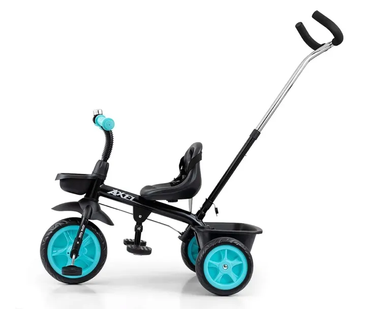 Rowerek AXEL posiada odczepianą rączkę dla rodzica oraz koszyk na zabawki.