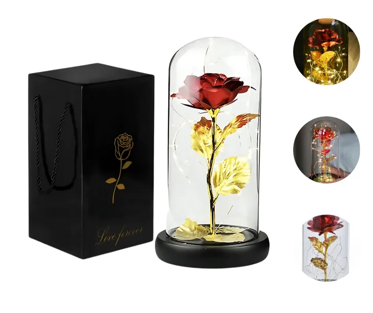 Magiczna róża w szklanej kopule – symbol wiecznej miłości Wprowadź odrobinę baśniowego uroku do swojego wnętrza dzięki eleganckiej róży zamkniętej w szklanej kopule – inspirowanej klasyczną opowieścią „Piękna i Bestia”. To niezwykle romantyczna dekoracja, która nie tylko przyciąga wzrok, ale również niesie głębokie przesłanie: prawdziwa miłość jest wieczna, odporna na czas i przeciwności losu. Każdy detal tej kompozycji został starannie dopracowany, by oddać piękno natury w niezwykle subtelnej, niemal magicznej formie.