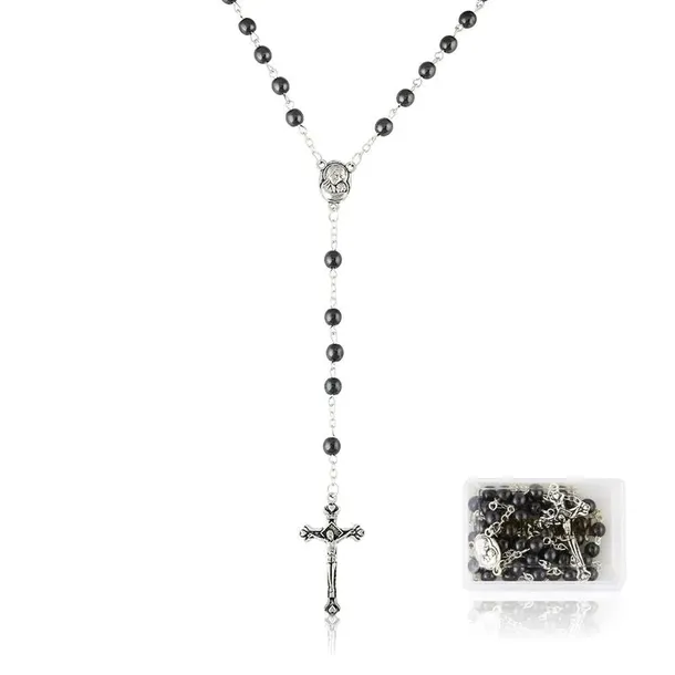 Tradycyjny różaniec wykonany z hematytowych paciorków w kolorze grafitowym, połączonych metalowymi łącznikami i zakończony krzyżykiem. Zapakowany w plastikowe prostokątne pudełko. Każdy powinien na co dzień być wyposażony w takie oto Narzędzie, jako niezbędnik na dobre i złe chwile. Narzędzie po które można sięgnąć w każdej chwili. Różaniec może być wyjątkowym prezentem z okazji uroczystości religijnych.