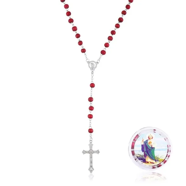Tradycyjny różaniec wykonany z drewnianych pachnących koralików połączonych metalowymi łącznikami. Zapakowany w przeźroczyste pudełko z obrazkiem Świętym. Motywy obrazków wysyłane są losowo i mogą się różnić od tych na zdjęciach. Każdy powinien na co dzień być wyposażony w takie oto Narzędzie, jako niezbędnik na dobre i złe chwile. Narzędzie po które można sięgnąć w każdej chwili. Różaniec może być wyjątkowym prezentem z okazji uroczystości religijnych.