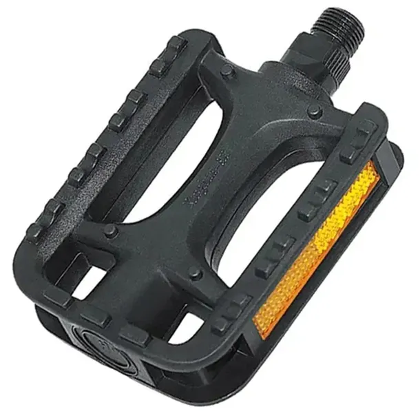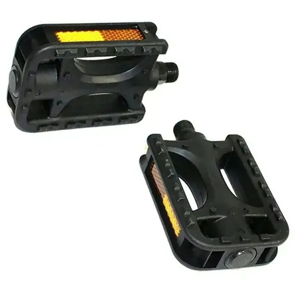 Komplet 2 standardowych pedałów rowerowych. Wyposażone w standardowy gwint montażowy 14 mm (9/16''). Solidne łożyska kulkowe zapewniają długie użytkowanie. Każdy z pedałów wyposażony został w obustronne odblaski.
