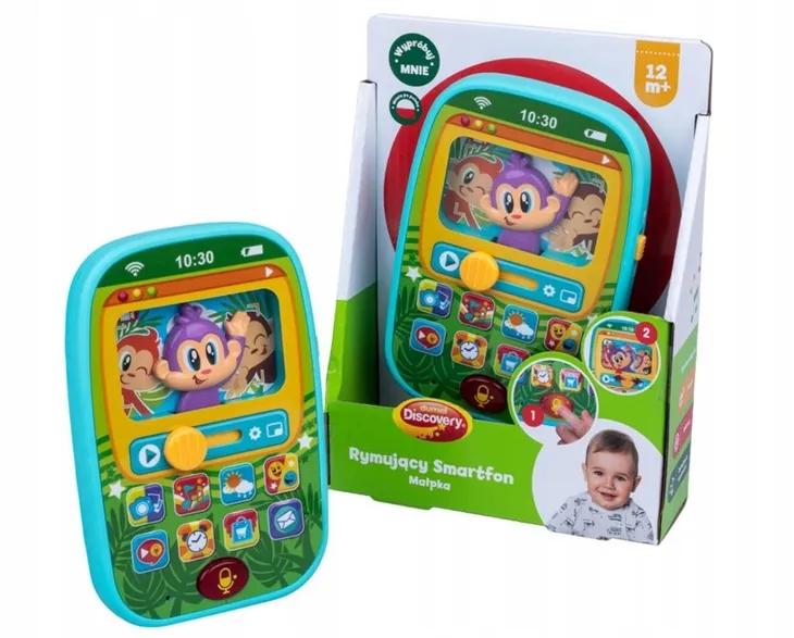 Rozpocznij swoją przygodę z telefonem od rymującego smartfonika, w którym zabawna małpka pochowała mnóstwo tematycznych rymowanek i realistycznych odgłosów. Zabawka posiada również funkcję nagrywania i odtwarzania głosu, z możliwością jego modyfikacji. Praktyczny wyłącznik dźwięku, umieszczony z boku smartfonu, pozwala na wyłączenie go po zakończonej zabawie