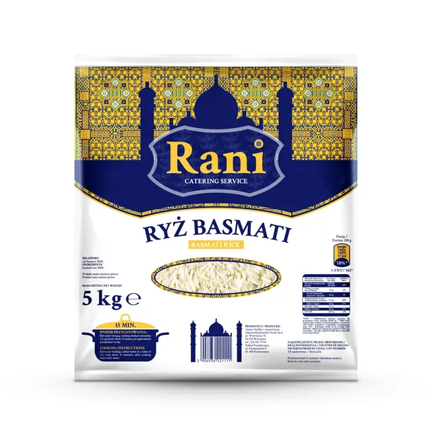 Ryż Basmati marki Rani uznawany jest za najszlachetniejszy na świecie. W dosłownym tłumaczeniu basmati oznacza pachnący ryż. Ma długie, smukłe, śnieżnobiałe ziarna, które podczas dotowania jeszcze bardziej się wydłużają. Ryż Basmati jest niezwykle sypki. Doskonale pasuje do dań z ryb, drobiu i mięsa. Jest niezastąpionym i niezwykle cenionym przez miłośników kuchni indyjskiej dodatkiem kulinarnym.