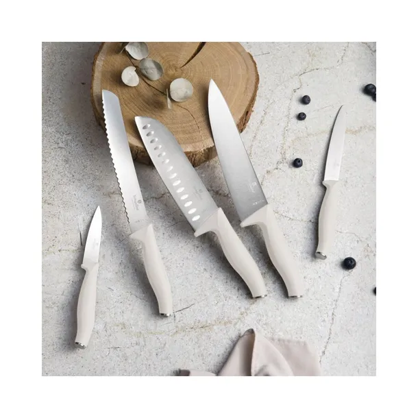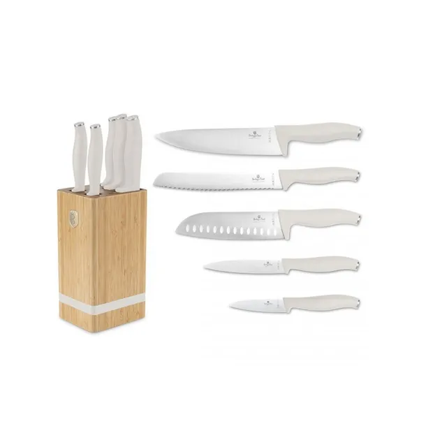 6 elementowy zestaw noży bloku bambusowym firmy BERLINGER HAUS z serii Sahara Collection. Przeznaczone do porcjowania mięsa i ryb, krojenia pieczywa oraz obierania i siekania warzyw. Noże wykonane wysokiej jakości stali nierdzewnej Ferrinox 18/10 o wysokiej zawartości węgla 1.4028/X30Cr13. Istotną cechą tej stali jest fakt, że jest odporna na wszelkiego rodzaju zadrapania, zarysowania, charakteryzuje się zwiększoną odpornością na ścieranie i korozję. Wyposażone w uchwyty pokryte bardzo trwałą cienką warstwą silikonu dla uzyskania pewnego trzymania w każdych warunkach. Noże drewnianym bambusowym bloku. Całość stanowi niebanalny element dekoracyjny w każdej kuchni. Zestaw zawiera wszystkie niezbędne noże do codziennego przygotowywania posiłków.W zestawie: