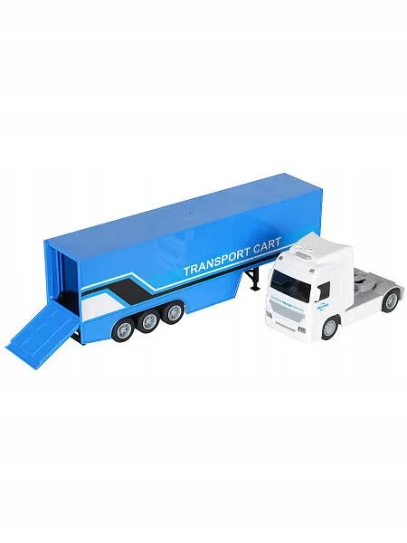 Zestaw składa się z białej ciągnika siodłowego oraz niebieskiej naczepy kontenerowej z napisem "TRANSPORT CART". Naczepa wyposażona jest w rampę ładunkową, która może być opuszczana i podnoszona, co umożliwia realistyczną zabawę w transport towarów. Solidna konstrukcja z wysokiej jakości plastiku zapewnia długotrwałą zabawę. Zabawka doskonale odwzorowuje prawdziwe pojazdy transportowe, co czyni ją nie tylko źródłem rozrywki, ale także narzędziem edukacyjnym. Dzieci mogą poznawać zasady działania transportu drogowego, rozwijać koordynację wzrokowo-ruchową oraz umiejętności planowania i organizacji podczas zabawy.