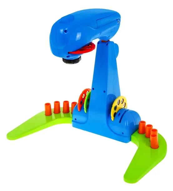 Projektor nie zajmuje wiele miejsca, można go całkiem złożyć po skończonej zabawie. Na podstawie projektora znajdują się kubeczki do przechowywania mazaków oraz krążków do rzutnika.