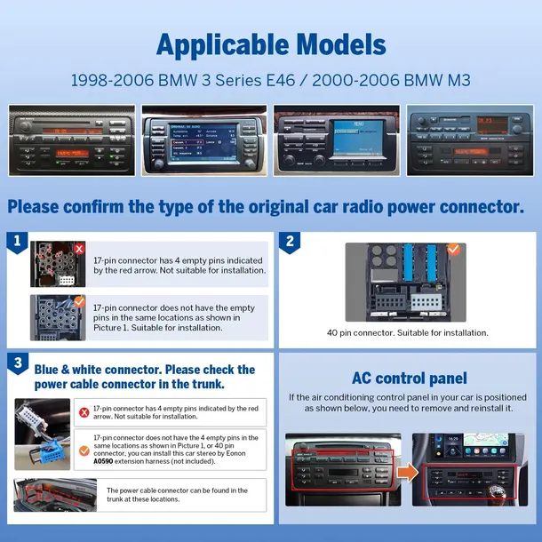 Radio samochodowe E46X7 z systemem Android 14 jest kompatybilne z modelami BMW E46 serii 3 z lat 1998-2006 oraz BMW M3 z lat 2000-2006. Nie wymaga dodatkowej ramki ani wymiany okablowania, wystarczy podłączyć i korzystać. Jeśli panel sterowania klimatyzacją znajduje się w środkowej części konsoli, należy go zdemontować i zamontować pod radiem samochodowym E46X7.