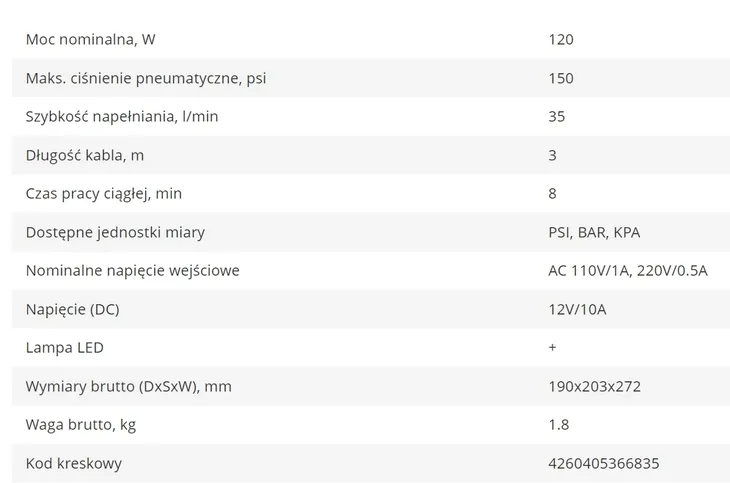 Wyposażony w funkcję autostopu – automatyczne przerwanie dopływu powietrza po osiągnięciu określonych parametrów. Posiada kabel o wystarczającej długości - 3 m dla wygody użytkowania.
