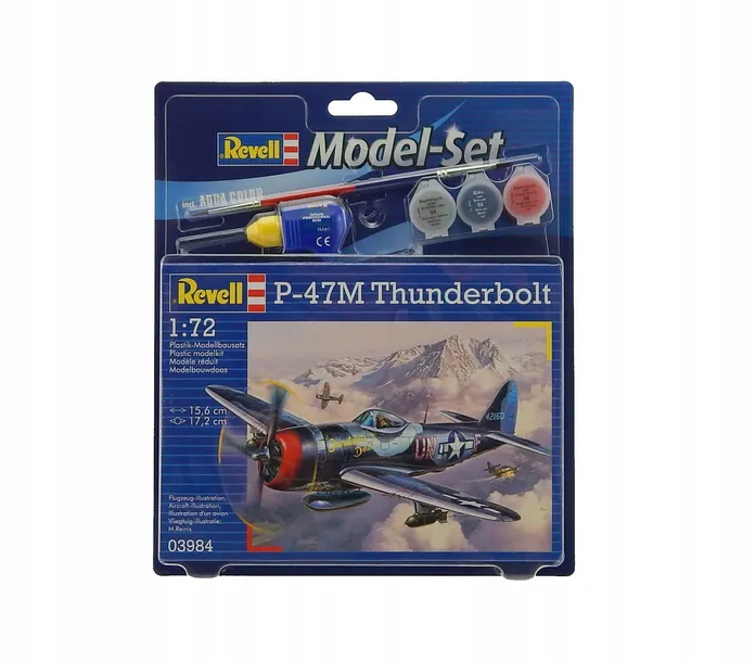 P-47 Thunderbolt (piorun) - najcięższy, jednomiejscowy samolot myśliwski i myśliwsko-szturmowy. Uważany za jeden z trzech najlepszych amerykańskich myśliwców z okresu II wojny światowej. Zalecane kolory farb: 32105, 32109, 32115, 32136, 32156, 32157, 32165, 32168, 32183, 32189, 32190, 32191, 32199, 32364. Plastikowy model do sklejania Revell ( REV-03984 ) nie zawiera w komplecie farb i kleju. Specyfikacja Numer katalogowy:REV-03984 Producent: Revell Długość: 156 mm Rozpiętość skrzydeł: 172 mm Skala: 1:72 Stopien trudności: 3 Ilość elementów: 67 Instrukcja: tak