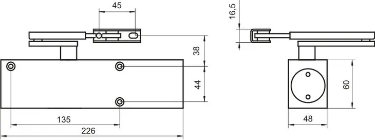- Regulacja skokowa siły zamykania w zakresie EN 2/4/5 przez przestawienie położenia samozamykacza względem osi zawiasów.