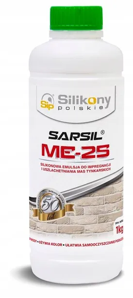 STOSOWANIESARSIL® ME-25 może być stosowany jako: • dodatek uszlachetniający w produkcji różnego rodzaju tynków fasadowych, dodawany do mas tynkarskich w postaci nierozcieńczonej w ilości od 0,4 do 0,7%. • dodatkowe spoiwo silikonowe w produkcji farb, dodawany w ilości do 10 %. • środek do zewnętrznej powierzchniowej impregnacji po uprzednim rozcieńczeniu wodą w stosunku 1:5 do 1:6.IMPREGNACJA POWIERZCHNIOWAImpregnowana powierzchnia powinna być sucha, chłonna, czysta ( a zwłaszcza nie zatłuszczona). Należy zabezpieczyć wszystkie powierzchnie, które nie będą impregnowane (np. szyby, części metalowe, polerowane kamienie, drewno itp.) przed kontaktem z impregnatem. W przypadku ich zanieczyszczenia w trakcie impregnowania, należy je natychmiast zmyć benzyną lakową. Beton, tynki cementowo-wapienne, spoiny w elewacjach kamiennych, można impregnować nie wcześniej niż po upływie 21-28 dni po ich utwardzeniu. Podłoża naprawiane zaprawami lub szpachlówkami można impregnować po upływie 6 dni (po ich utwardzeniu i wyschnięciu).Prace z rozcieńczonym SARSIL'em ME-25 powinno się prowadzić przy temperaturze od +5do+30°C, w warunkach suchej, bezdeszczowej pogody. Zaimpregnowane powierzchnie należy chronić przed deszczem przez 24 godziny.Jeśli impregnujemy mało chłonne powierzchnie (granit, łupek), nie należy zostawiać niewchłoniętego impregnatu na powierzchni zabezpieczanych materiałów. Nadmiar niewchłoniętego środka należy usunąć przed jego wyschnięciem (po 15 minutach od impregnacji)APLIKACJA:Impregnację można wykonać przy użyciu pędzla lub natryskowo (np. opryskiwaczem ogrodowym) a także przez zanurzanie małych elementów w roztworze na ok. 5 minut. Zaleca się dwukrotną impregnację w krótkich odstępach czasu metodą „mokre na mokre". Drugą warstwę należy nakładać dopóki powierzchnia jest jeszcze wilgotna (w zależności od temperatury otoczenia i porowatości materiału, nie później niż po upływie 30 minut). Powierzchnia powinna być nasycona impregnatem dokładnie i równomiernie. Cały impregnat powinien wsiąknąć w powierzchnię impregnowanego materiałuWYDAJNOŚĆ:7-12 m2 z 1 kg koncentratu rozcieńczonego wodą (Wydajność określono przyjmując 1 kg SARSIL®'u ME-25 w postaci handlowej tj. koncentratu rozcieńczonego w określonych proporcjach woda i 2-krotne nanoszenie). Zużycie środka zależy od chłonności impregnowanego materiału i techniki impregnacji.Uwaga!Prace ze środkiem impregnującym SARSIL® ME-25 należy wykonywać stosując rękawice i okulary ochronne. Zapewnić skuteczną wymianę powietrza. Zachować ogólne zasady BHP oraz inne zawarte na etykiecie.Magazynowanie:Przechowywać w oryginalnych opakowaniach, w krytych i suchych pomieszczeniach w temperaturze od 5 do +30°C. Chronić przed mrozem.