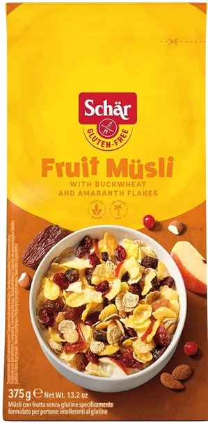 Schar Musli Fruit 375 g to produkt pochodzący od austriackiej marki Schar, która tworzy bezglutenowe wersje popularnych produktów śniadaniowych z wykorzystaniem naturalnych składników. Musli charakteryzuje się różnorodną teksturą łączącą chrupkące płatki z miękkimi kawałkami suszonych owoców takich jak rodzynki, suszone jabłka, morele czy żurawina. Może być spożywane z mlekiem, jogurtem, napojami roślinnymi lub jako dodatek do koktajli owocowych, a bogactwo składników zapewnia długotrwałe uczucie sytości.