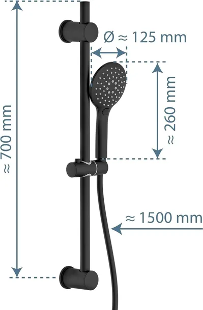Schütte 64916 Raven Duschstange i słuchawka prysznicowa | Słuchawka prysznicowa z 3-stopniową regulacją | Zestaw prysznicowy z kolumną prysznicową | Panel prysznicowy z deszczownicą i wężem | Czarny