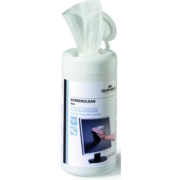 Ściereczki Screenclean służą do czyszczenia ekranów i powierzchni szklanych. Nasączone są bezalkoholowym płynem. Ściereczki nie pozostawiają pyłów i smug na czyszczonych powierzchniach. Ponadto, zapobiegają gromadzeniu się ładunków elektrostatycznych. Pojedynczy pojemnik zawiera 100 biodegradowalnych ściereczek do ekranów. Durable jest jednym z wiodących niemieckich producentów markowych produktów do prezentacji oraz organizacji środowiska biurowego. Przyjazny dla środowiska zgodnie z ISO 14021 (w 100 % nadający się do recyklingu).
