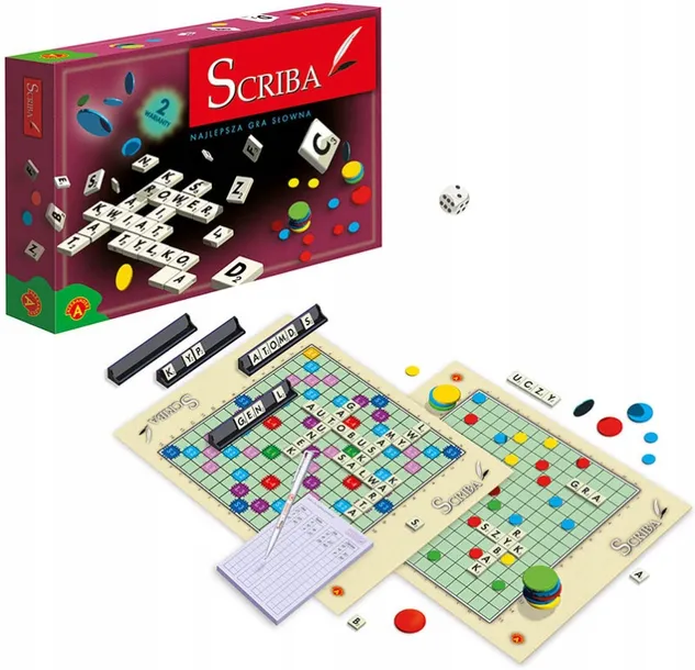 Scriba to dwie różne wersje najatrakcyjniejszej i najbardziej emocjonującej gry słownej. Łączy w sobie cechy gier logicznych, strategicznych i losowych. Zasady gry uczą i zmuszają graczy do używania poprawnych form gramatycznych. Uczestnicy gry poszerzają swoje słownictwo. Ciekawe zasady rywalizacji w połączeniu z rekwizytami sprawiają, że ,,Scriba jest interesującą grą dla każdego kto umie czytać i pisać. To gra, dzięki której ćwiczy się koncentrację, logiczne myślenie i wyobraźnię.Zawartość opakowaniadwustronna plansza, 100 tabliczek z literami, 3 puste tabliczki, 3 tabliczki ze strzałkami, 2 tabliczki z czarnym kołem, 4 półeczki, 60 żetonów, worek z tkaniny, kostka do gry, notes, długopis, instrukcja.