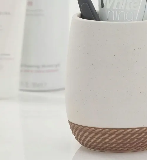Jeden kubek, dwa odcienie piasku. Dolna część ozdobiona dekoracją w formie zaplecionej liny.