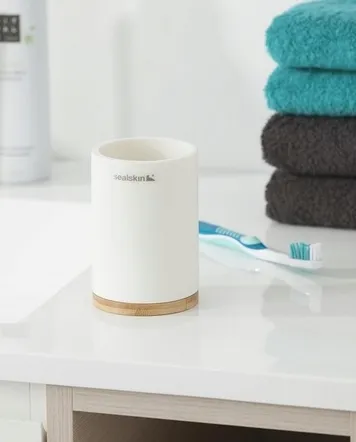 Łączone materiały to aktualny trend. Seria Sealskin Grace z białej żywicy poliestrowej w połączeniu z bambusowymi akcentami idealnie do tego pasuje. Kubek można łatwo wyczyścić wilgotną ściereczką.