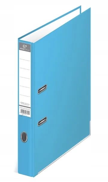 Segregator w formacie A4. Szerokość grzbietu: 50 mm. Okładka zabezpieczona folią polipropylenową. W środku papierowa wyklejka. Wyposażony w 2 ringi oraz dźwignię z dociskaczem. Wzmocniony otwór na palec. Dolne krawędzie usztywnione metalową szyną. Wymienna etykieta grzbietowa.