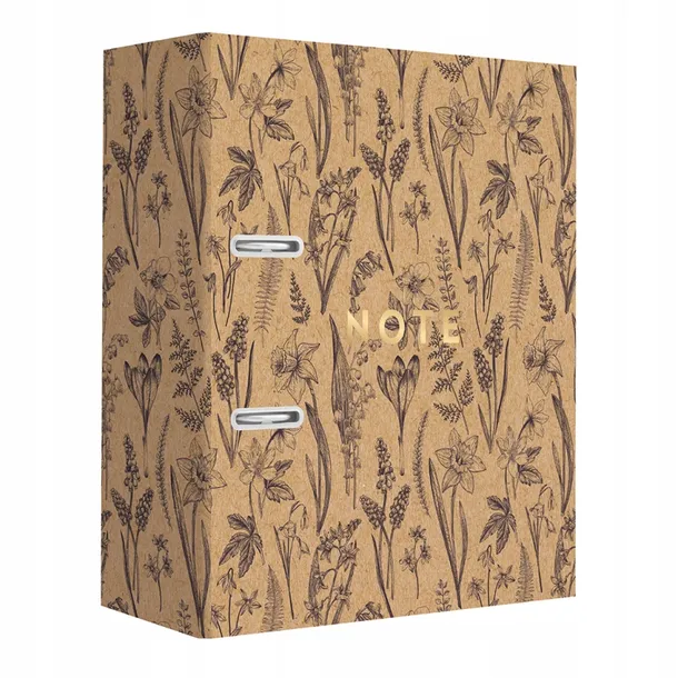 Segregator w formacie A4. Szerokość grzbietu: 75 mm. Okładka wykonana z eleganckiego i trwałego kartonu kraft ze złotymi elementami w technologii hot-stamping. W środku papierowa wyklejka. Wyposażony w 2 ringi oraz dźwignię z dociskaczem.