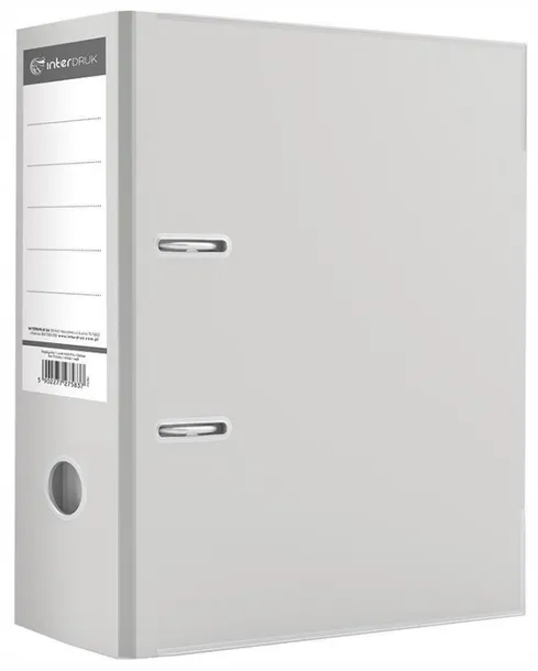 Segregator w formacie A4. Szerokość grzbietu: 75 mm. Okładka zabezpieczona folią polipropylenową. W środku papierowa wyklejka. Wyposażony w 2 ringi oraz dźwignię z dociskaczem. Wzmocniony otwór na palec. Dolne krawędzie usztywnione metalową szyną. Wymienna etykieta grzbietowa.