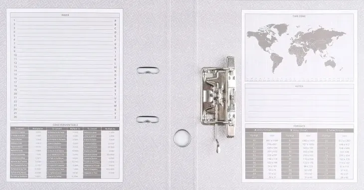 - wewnątrz wyklejka papierowa z indeksem, tabelą formatów, mapą stref czasowych oraz miejscem na notatki