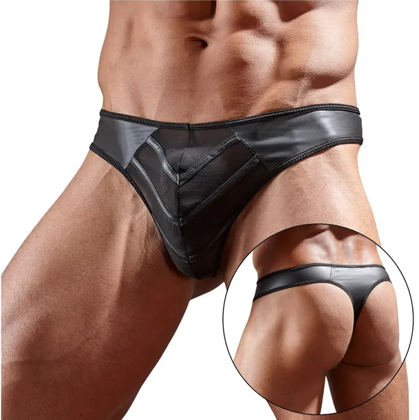 Czarne, szalenie seksowne męskie stringi wykonane z elastycznej tkaniny w połączeniu z przezroczystą siateczką. Tył stringów to gładki matowy materiał o delikatnym połysku. Z przodu lekko przezroczysta siateczka ozdobiona naszytymi paskami. Stringi idealnie dopasowują się do ciała i podkreślają męskie wdzięki.