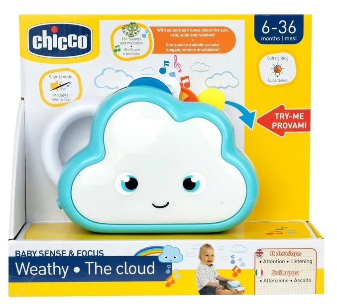 Chmurka to elektroniczna zabawka, która uczy elementów związanych z pogodą, łącząc je z kształtami, melodiami, dźwiękami i kolorami.Zabawka przedstawia 4 stany pogodowe: deszcz, wiatr, tęczę i słońce.Każdy element pogody jest powiązany z określonym kształtem, kolorem, dźwiękiem i melodią.Maluch, aby odkrywać kolejne rodzaje związane ze zjawiskami pogodowymi, wysuwa kolorowe elementy, ćwicząc małą motorykę.Zabawka oferuje tryb wyciszenia, w którym efekty dźwiękowe mogą być wyłączone.Co więcej, chmurka zapala się miękkim światłem w zależności od wysuniętego elementu, zapewniając dodatkowe, delikatne bodźce.Zabawka uczy dziecko kolorów, a także rozwija jego uwagę, umiejętności słuchowe i umiejętności koordynacji manualnej. Zabawka przeznaczona jest dla dzieci w wieku: 6-36MWymiary zabawki: 17 x 6 x 13 cmZabawka działa na 3 baterie typu AAA 1,5V (w zestawie)