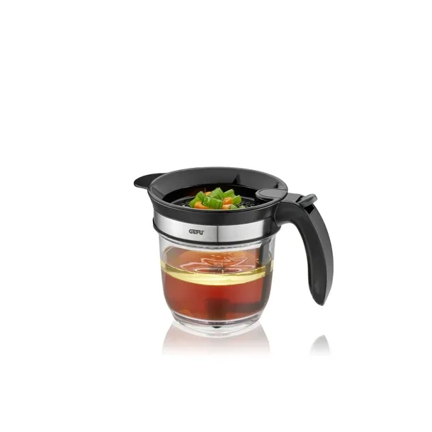 Chcesz cieszyć się zupą lub sosem bez zbędnej zawartości tłuszczu? Dzbanek do oddzielania tłuszczu FLUIDO może Ci w tym pomóc! Ponieważ olej zawsze osiada się na wierzchu sosów, wywarów itp., separator przejmuje zadanie oddzielenia go od reszty. Wlej do dzbanka gorącą zupę, a gdy tylko tłuszcz osiądzie na wierzchu, możesz przelać odtłuszczony wywar do nowego pojemnika. Przycisk na uchwycie otwiera dziurę w podstawie dzbanka. Dodatkowo praktyczne sitko zatrzymuje wszelkie ciała stałe - bez czasochłonnego filtrowania! Na dzbanku znajduje się również miarka, która ułatwia precyzyjne dozowanie płynu.