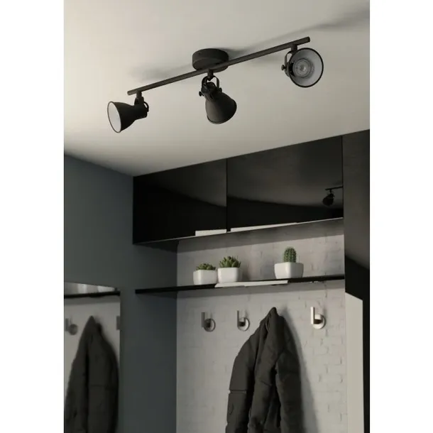 Lampa ścienna, sufitowa serii SERAS. Potrójny reflektorek w kolorze czarnym. Regulowane główki pozwalają na skierowanie światła w dowolnym kierunku. Źródło światła to wymienne żarówka LED GU10. Lampa dostarczana jest w zestawie z żarówkami LED o mocy 3W, która emitują ciepłą barwę światła.