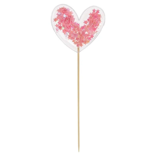 Dekoracyjne serce na patyczku. Serce wykonane z przezroczystego tworzywa sztucznego. W serduszku znajduje się ozdobne błyszczące konfetti w kolorze różowym. Idealne jako dekoracja bukietów, koszy i kompozycji z kwiatami, upominków na ślub, rocznicę, walentynki. Rozmiar dekoracji z patyczkiem: 20 cm.