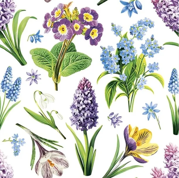 Wiosenne serwetki papierowe z kwiatową tapetą marki Daisy idealnie komponują się z każdą zastawą. To dekoracyjne serwetki z motywem kwiatów, które podkreślają charakter wiosennych przyjęć. Białe serwetki z wiosennymi kwiatami - szafirkami, przebiśniegami czy krokusami.
