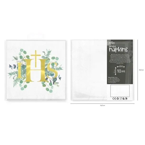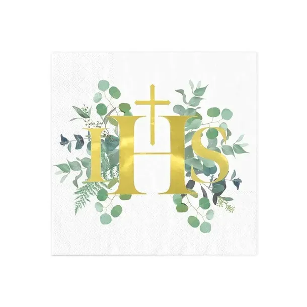 Serwetki komunijne z charakterystycznym dla serii Eukaliptus wzorem. Złoty symbol IHS z krzyżykiem nad literą H, otoczony jest zielonymi gałązkami eukaliptusa.