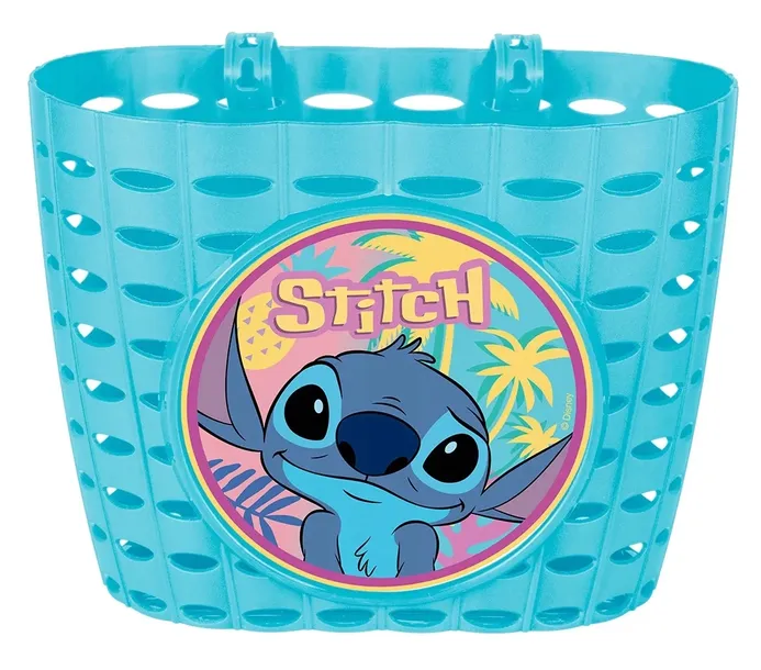 Koszyczek na kierownicę jest wykonany z kolorowego tworzywa sztucznego i ozdobiony naklejką z ulubionymi postacią Stitch.
