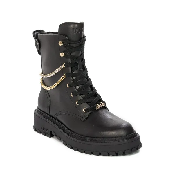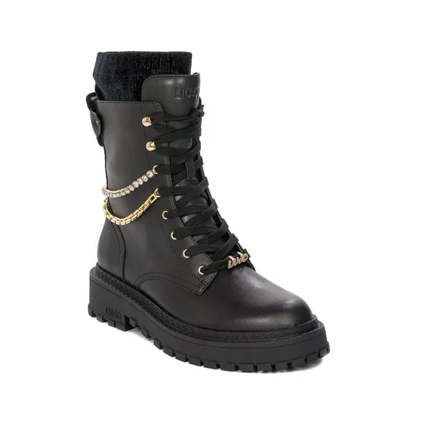 Oryginalne damskie trzewiki renomowanej marki Liu Jo to absolutny hit każdego sezonu. Najnowszy wzór botków od Liu Jo wykonany ze skóry naturalnej z domieszką ekologicznej w kolorze czarnym "Black". Wnętrze to tkanina i wysokogatunkowe tworzywo, natomiast wkładka wykonana jest ze skóry naturalnej. Umieszczony po wewnętrznej stronie cholewki zamek błyskawiczny ułatwi zakładanie i zdejmowanie. Dodatkowo sznurowadła pozwalają lepiej dopasować obuwie do potrzeb. Ozdobą tego modelu są łańcuchy w kolorze złotym, w tym jeden z cyrkoniami. Model na solidnej i masywnej podeszwie typu platforma, o wysokości 4 cm w obcasie i 2 cm z przodu. Skierowane do pewnych siebie kobiet, które lubią się wyróżniać i stawiają na odważne stylizacje. Wejdź w nowy sezon ze stylowym i modnym obuwiem od marki Liu Jo!