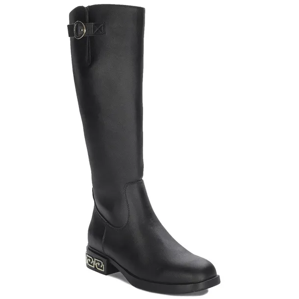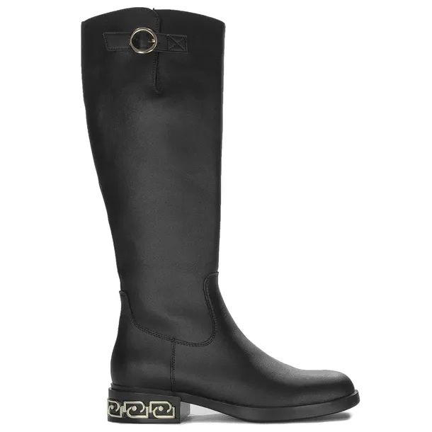 Kozaki od marki Liu Jo wykonane są z najwyższej jakości skóry ekologicznej w kolorze czarnym. Wysoka bo mierząca 39 cm cholewka skutecznie chroni nogi przed niezbyt korzystnymi warunkami pogodowymi. Na wewnętrznej jej stronie umieszczono zamek błyskawiczny, który pozwala na szybką i łatwą zmianę obuwia. Dodatkowo pasek ze sprzączką umożliwia minimalną regulację szerokości cholewki. Szerokość cholewki to 38 cm w rozmiarze 38(można regulować paskiem ze sprzączką). Wnętrze to skóra ekologiczna oraz tkanina, a wkładka to skóra naturalna. Podeszwa z obcasem o wysokości 3 cm. Kozaki te z powodzeniem można nosić zarówno w połączeniu ze spódnicami, sukienkami czy do spodni.