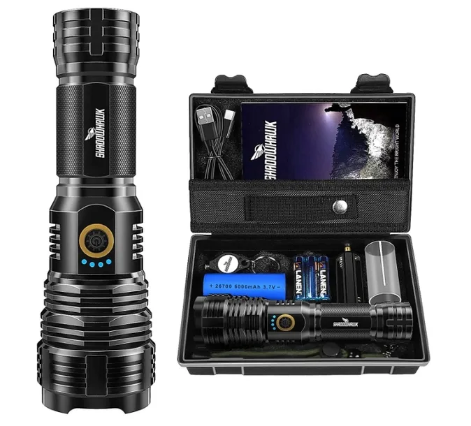 - Niezwykła wartościowa latarka kieszonkowa - 1 x latarka Shadowhawk S1915 LED 10000 lumenów, 1 x akumulator 6000 mAh 26700, 1 x kabel USB do ładowania, 3 x baterie AAA, 1 x brelok do kluczy, 1 x kabura na latarkę, 1 x instrukcja obsługi (może nie być dostępna w języku polskim), 1 x pudełko prezentowe Będziesz mile zaskoczony(-a) jasnością, jakością, trwałością i wydajnością tej niezwykle jasnej latarki LED. -