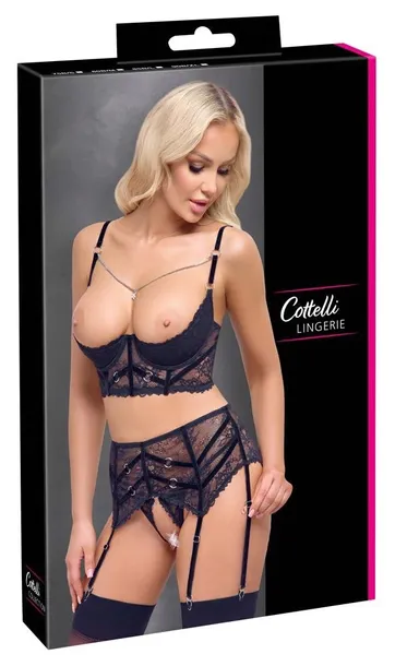 Koronkowe trio z dbałością o szczegóły!Biustonosz typu longline, pas do pończoch i stringi bez krocza połączone w elegancko erotyczny zestaw od Cottelli LINGERIE. Całość wykonana z delikatnej, miękkiej, czarnej koronki. Ozdobiony aksamitnymi tasiemkami i srebrnymi pierścieniami. Miseczki z fiszbinami o dłuższym kroju, lekko podszyte. Z odpinanym biżuteryjnym łańcuszkiem z dżetów w okolicy dekoltu. Zapięcie na haftki z tyłu i aksamitne ramiączka są regulowane. Szeroki pas do pończoch również ma regulowane zapięcie na haftki z tyłu. 6 aksamitnych pasków do pończoch jest również regulowanych. Małe stringi uwodzą otwartym kroczem.90% poliamid, 10% elastan.Dostarczane bez pończoch.