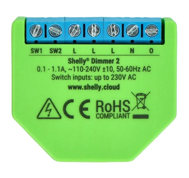 Gotowy do użycia, niewielki moduł Shelly Dimmer 2, który pozwala na sterowanie oświetleniem. Za jego pomocą można włączać / wyłączać światło, a także sterować jego jasnością. Współpracuje z urządzeniami 230 V o mocy od 10 W do 200 W. Sterownik posiada wbudowaną funkcję pomiaru poboru energii. Komunikuje się poprzez sieć WiFi z wykorzystaniem dedykowanej aplikacji.