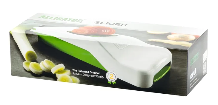Szybciej i bezpieczniej od kuchennego noża – Alligator Slicer to opatentowany w Szwecji wynalazek służący do błyskawicznego krojenia cebuli, owoców i warzyw! Mechanizm tnący składa się z nierdzewnych ostrzy, które przy zwykłym naciśnięciu kroją plastry o szerokości ok. 0,5 cm, nie stwarzając zagrożenia dla palców.