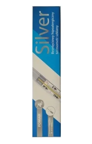 SILVER termometr szklany, bezrtęciowy, dzięki czemu nie zagraża zdrowiu i środowisku, zapewniając precyzyjny pomiar temperatury dla całej rodziny.