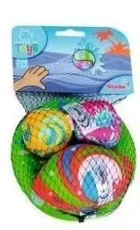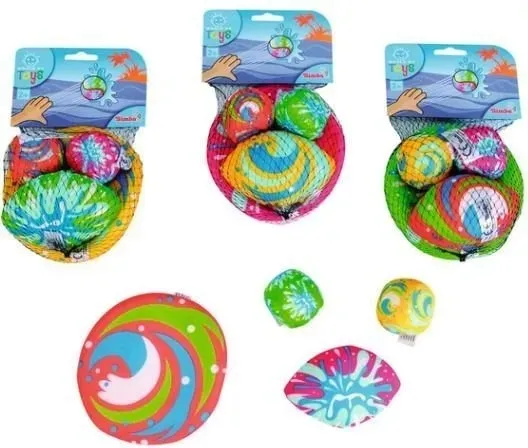 Miękkie, kolorowe bomby wodne o różnych kształtach: frisbee 16 cm, piłka do futbolu 14 cm oraz dwie piłeczki 6 cm, 4 rodzaje.